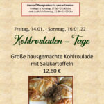 Freitag, 14.01. & Sonntag, 16.01.22   Kohlrouladen-Tage Hausgemachte große Kohlroulade  dazu Salzkartoffeln pro Person 12,80 €...
